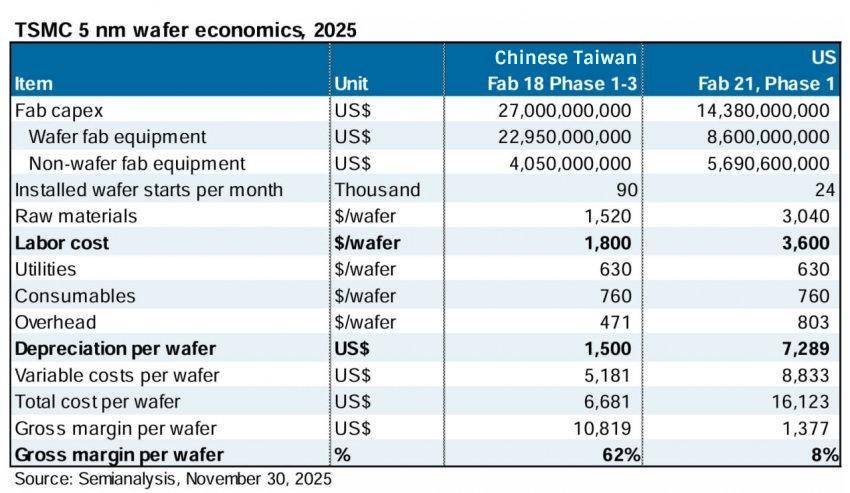 SemiAnalysis 数据显示,台积电美国晶圆厂的运营成本明显高于中国台湾地区,单位晶圆的折旧费用和人力成本被认为是推高整体成本的主要因素。