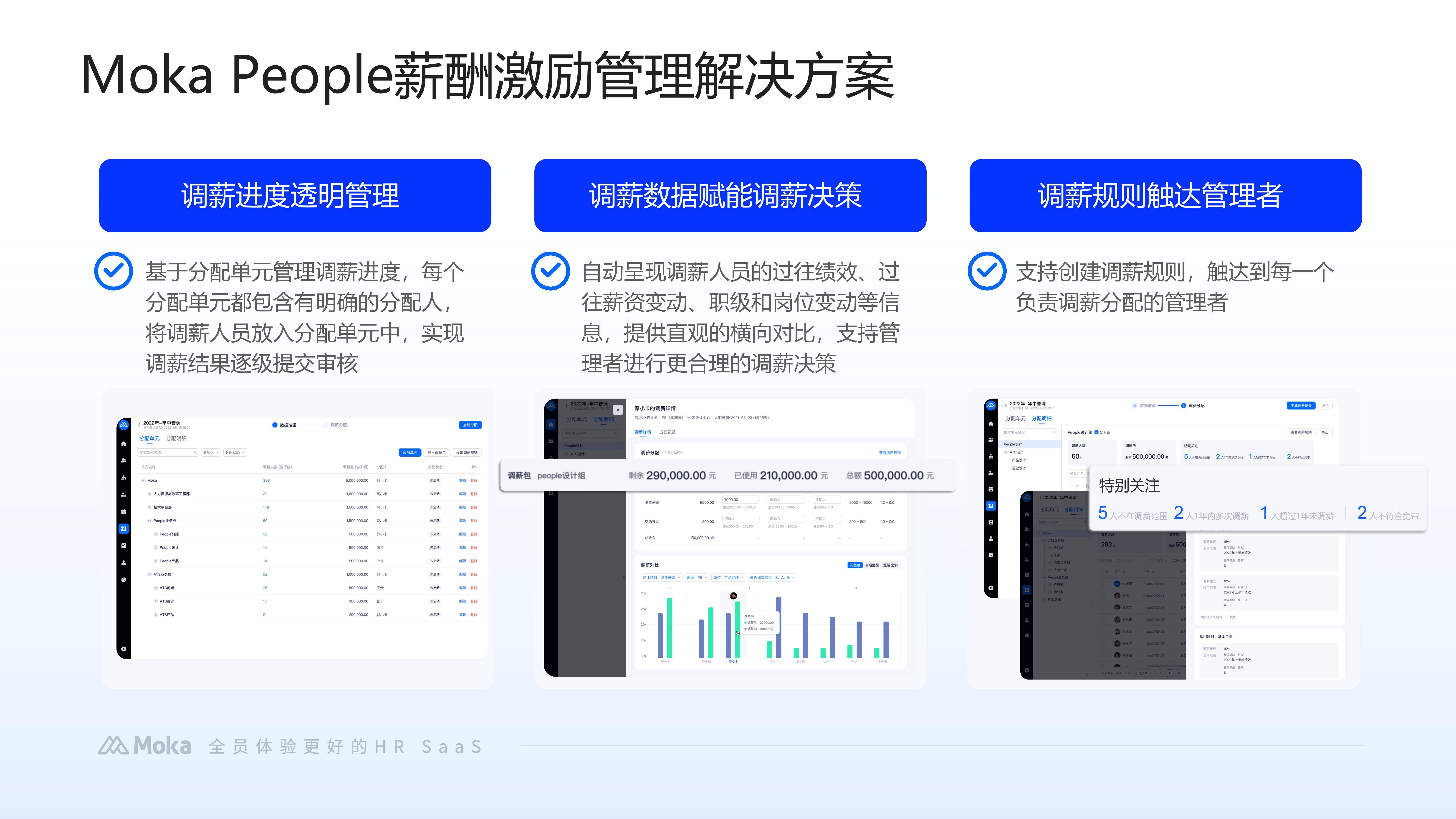 Moka People 的薪酬管理功能可与组织人事、绩效管理等模块无缝衔接,实现薪酬数据的实时流转与共享,助力企业建立常态化的薪酬结构优化与成本管控机制,提升人力资源管理效率。