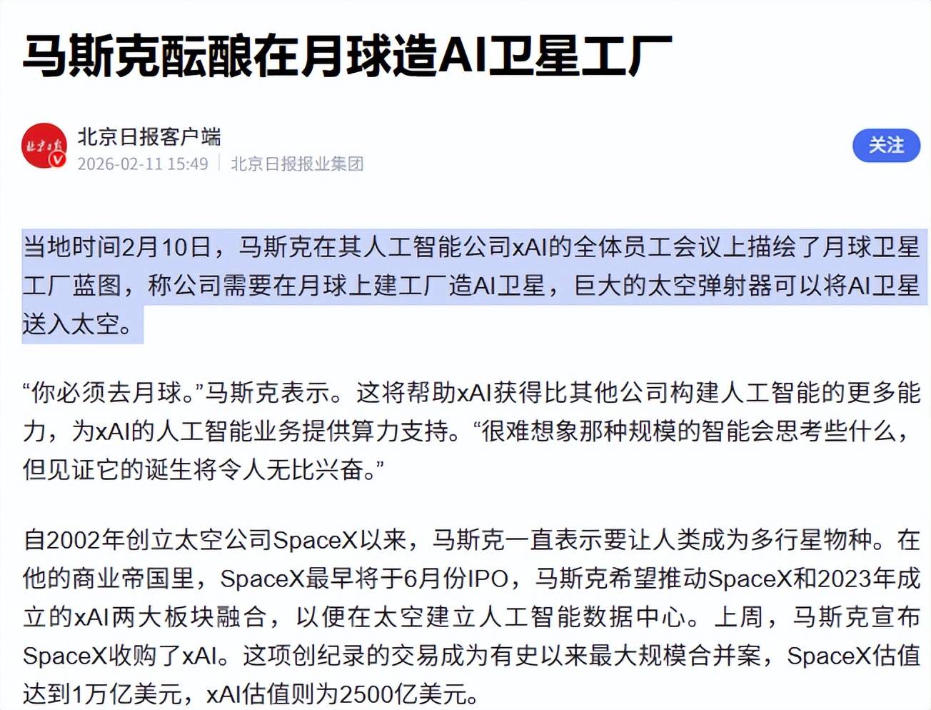 2026年2月11日,马斯克在员工大会上宣布SpaceX和xAI合并,并计划在月球建立工厂。