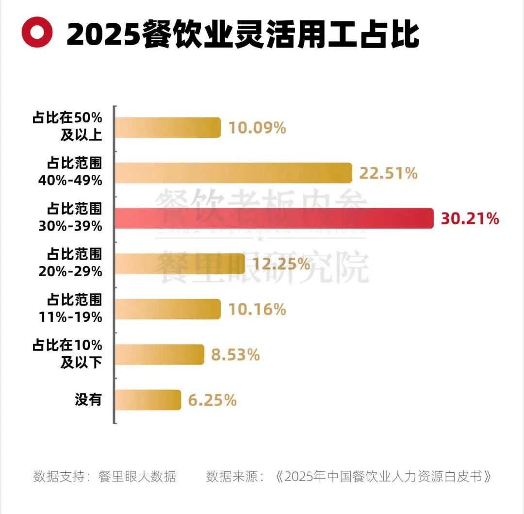 根据最新行业调研数据,2025年餐饮行业中灵活用工占比最高的区间为30%-39%,显示出该用工模式已在业内形成主流趋势。