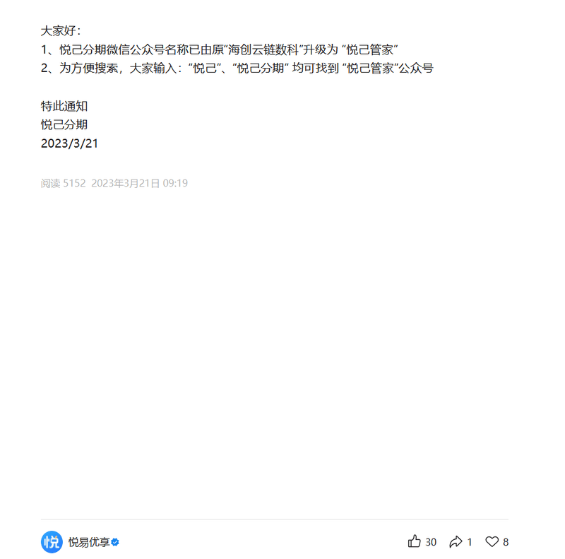 “悦易优享”公众号认证的公司为重庆辉科诺数字科技有限公司,股权穿透背后,大股东为海尔集团公司。值得一提的是,该公众号2023年3月发文显示,悦己分期公众号名称已升级为“悦己管家”,又于2025年11月迁移至公众号“悦易优享”。
