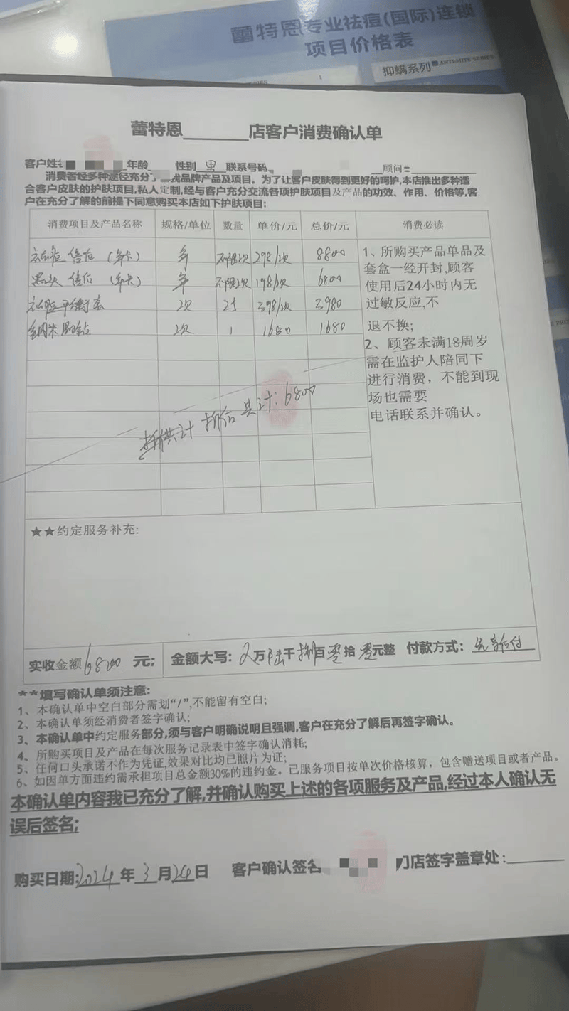 白先生就是其中之一。冲着18.8元的祛痘体验,白先生走进了一家名为“蕾特恩”的美容院,在体验项目结束后,店员为白先生做了一次皮肤检测,在层层话术的推销下,被“容貌焦虑”裹挟的白先生签下了一份分期支付的消费确认单。