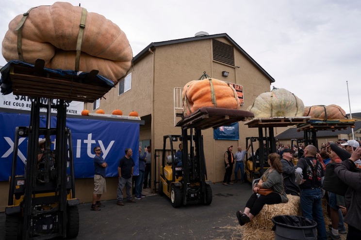 10月9日,在美国加利福尼亚州圣马特奥县半月湾举行的南瓜称重大赛现场,人们围观参赛的南瓜。新华社发(摄)